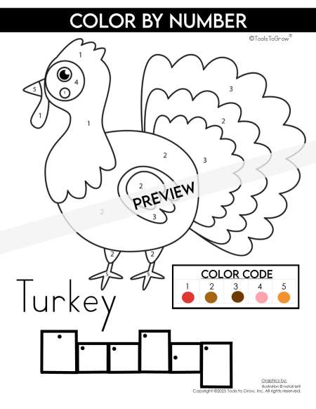 Color by Number TURKEY. Includes numbers 1 - 5.
