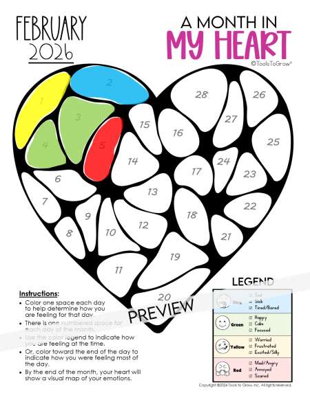 Instructions: Color one space each day to help determine how you are feeling for that day. There is one numbered space for each day of the month. Use the color legend to indicate how you are feeling at the time. Or, color toward the end of the day to indicate how you were feeling most of the day. By the end of the month, your heart will show a visual map of your emotions.