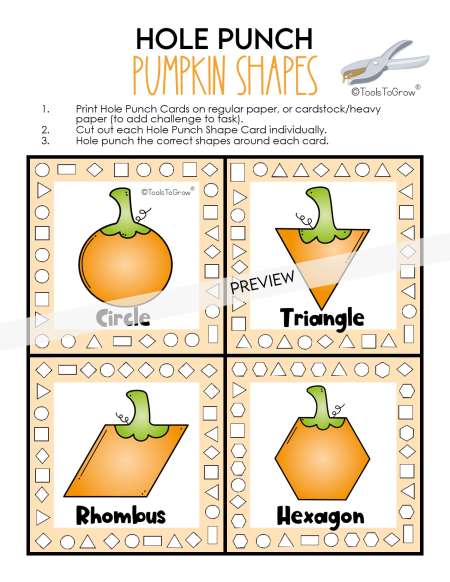 To Complete: The adult determines the number of pumpkin puzzles/shapes the child will match. Provide child with pumpkin puzzle pieces. Child will match the pieces together to form a pumpkin with a stem on top. Repeat for all pumpkin puzzles. Optional: hide the pumpkin puzzle pieces around the room for the child to search and find!