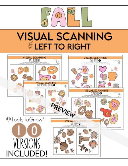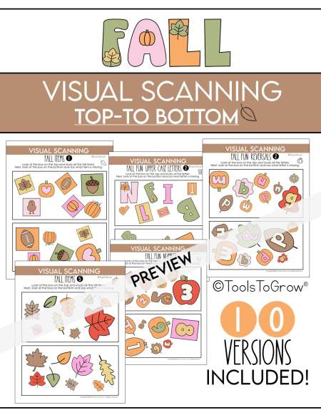 Includes scanning for fall items, numbers, uppercase letters, and reversals. Look at the box on the top and study all the fall items. Next, look at the box on the bottom and say what item is missing.