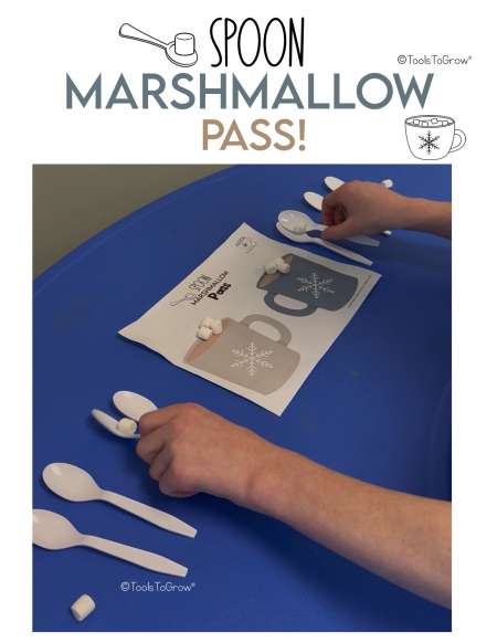 Using both hands at the same time, pick up the first outer spoon. Pass the pom-pom/marshmallow from one spoon to the next. In order to do this, child will flip the spoon, dropping marshmallow from one spoon to next. Move the marshmallow from the outer spoon to the hot chocolate mat.