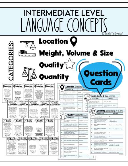 ABOUT: Through the use of these intermediate level question cards, students will be given the opportunity to expand their vocabulary and use critical thinking to answer questions related to the following: Location, Weight, Volume & Size, Quality, and Quantity. DIRECTIONS FOR USE: Individual & Group Use- The therapist will share the card. The child or adult will read the question out loud. If completing the activity in a group, children can take turns answering.