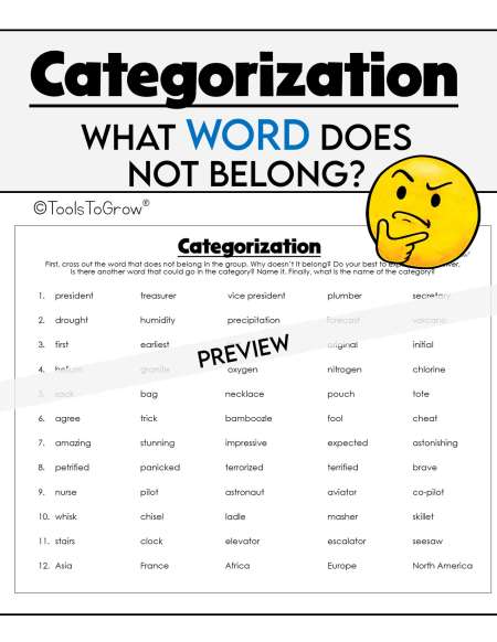 First, cross out the word that does not belong in the group. Why doesn’t it belong? Do your best to explain your answer. Is there another word that could go in the category? Name it. Finally, what is the name of the category?