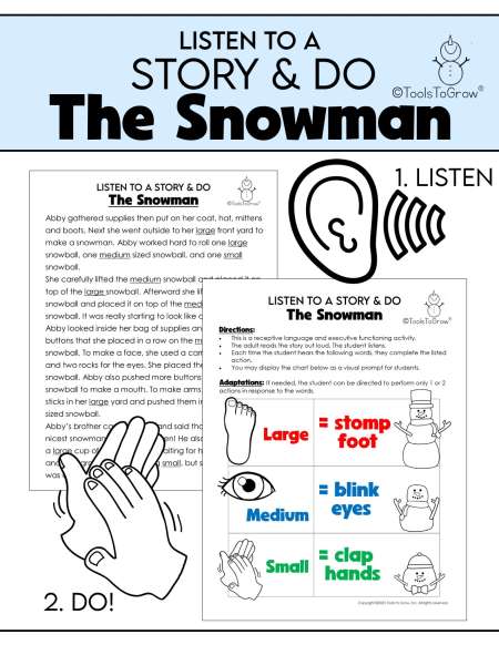Directions: This is a receptive language and executive functioning activity. The adult reads the story out loud. The student listens. Each time the student hears the following words, they complete the listed action. You may display the chart as a visual prompt for students.