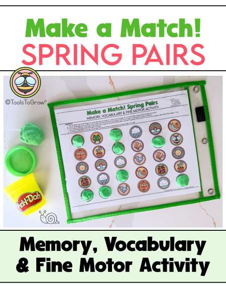 Laminate or place dough mat in clear sleeve protector. The student will use dough to roll a ball, then pound flat onto designated rain drop image. May use for word recognition, vocabulary building, articulation practice, matching, and/or memory games. Use with Spring Vocabulary Cards!