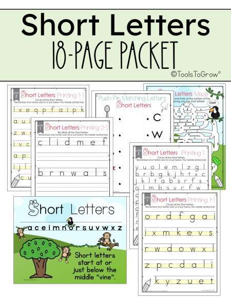 This 18 PAGE PDF packet includes Common Core Aligned material that address "Short Letters" (a c e i m n o r s u v w x z). This includes 3 levels of worksheets based on the printing level of the student (3/4 inch three lined paper, 1/2 inch three lined paper, and single lined paper). Also included is a full page colorful poster, Letter Scanning practice, 2 mazes, and a push pin matching sheet.
