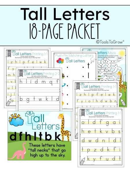 This 18 PAGE PDF packet includes Common Core Aligned material that address "Tall Letters" (b,d,f,h,l,k,t). This includes 3 levels of worksheets based on the printing level of the student (3/4 inch three lined paper, 1/2 inch three lined paper, and single lined paper). Also included is a full page colorful poster, Letter Scanning practice, 2 mazes, and a push pin matching sheet.