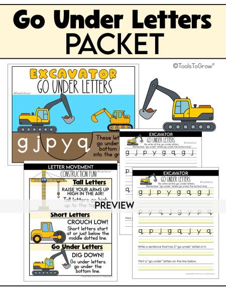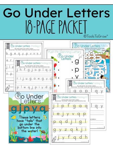 This 18 PAGE PDF packet includes Common Core Aligned material that address "Go Under Letters" (g,j,p,y,q). This includes 3 levels of worksheets based on the printing level of the student (3/4 inch three lined paper, 1/2 inch three lined paper, and single lined paper). Also included is a full page colorful poster, Letter Scanning practice, 2 mazes, and a push pin matching sheet.