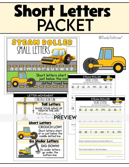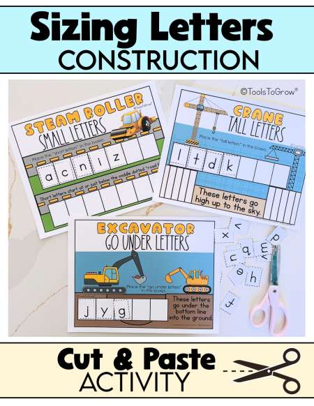 Versions Included: Tall Letters = Crane, Go Under Letters = Excavator, Small Letters = Steam Roller. Color + Black/White Versions Included! Instructions: Review teaching posters. Cut out all letters. Mix them up! Sort and glue letters in appropriate boxes/page.