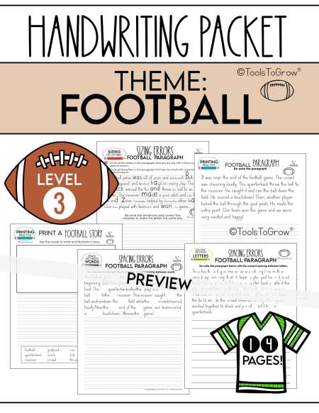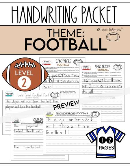 This 14 page PDF includes detailed HANDWRITING session plans with the theme "FOOTBALL". Categories Include: Printing Practice, Space Between Letters, Space Between Words, Sizing of Letters, and Line Adherence. Click on the Main Menu to go directly to that activity! 2 versions included in packet: (1) 1/4 inch 3-lined paper and (2) single-lined paper.
