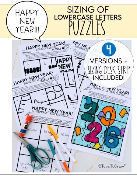 4 different Puzzles + Sizing Desk Strips (2 versions) included! Instructions: Match the letters based on the size to reveal a fun New Year mystery picture. Tall Letters go in the top squares, short letters in middle, and “go under” letters in the bottom squares. Refer to the desk strip and teaching visual for letter sizing.