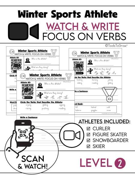 Winter Olympics Games. Instructions: Scan the QR code. Watch the video file. Who is the athlete? Write it on the line. What are they doing? Circle the icon. Next, circle all of the verbs that describe the athlete. In the empty spaces, add another verb or two that describes the athlete. Finally, print a sentence about the athletes that includes one of the verbs.
