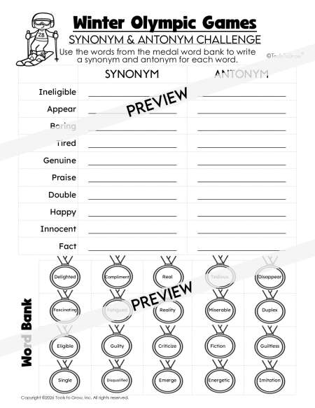 Use the words from the medal word bank to write a synonym and antonym for each word.