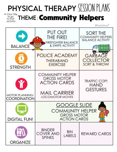 This 75 page PDF includes detailed session plans with the theme "COMMUNITY HELPERS". Categories Include: Balance, Strength, Motor Planning/Coordination, Digital Activities, and Organize. Click on the Main Menu to go directly to that activity!