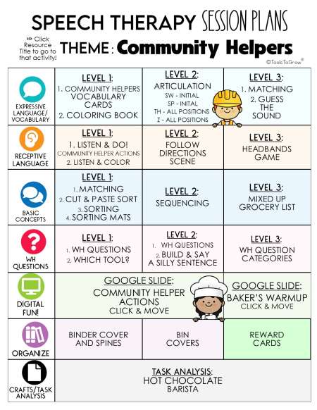 This 108 page PDF includes detailed session plans with the theme "COMMUNITY HELPERS". Categories Include: Expressive Language/Vocabulary, Receptive Language, Learning Concepts, WH Questions, Digital Activities, Task Analysis, and Organize. Click on the Main Menu to go directly to that activity!