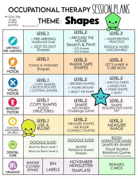 This 95 page PDF includes detailed session plans with the theme "SHAPES". Categories Include: Writing/Pre-Writing, Fine Motor, Visual Motor, Sensory Motor, Life Skills/Executive Functioning, Digital Activities, and Organize. Click on the Main Menu to go directly to that activity!